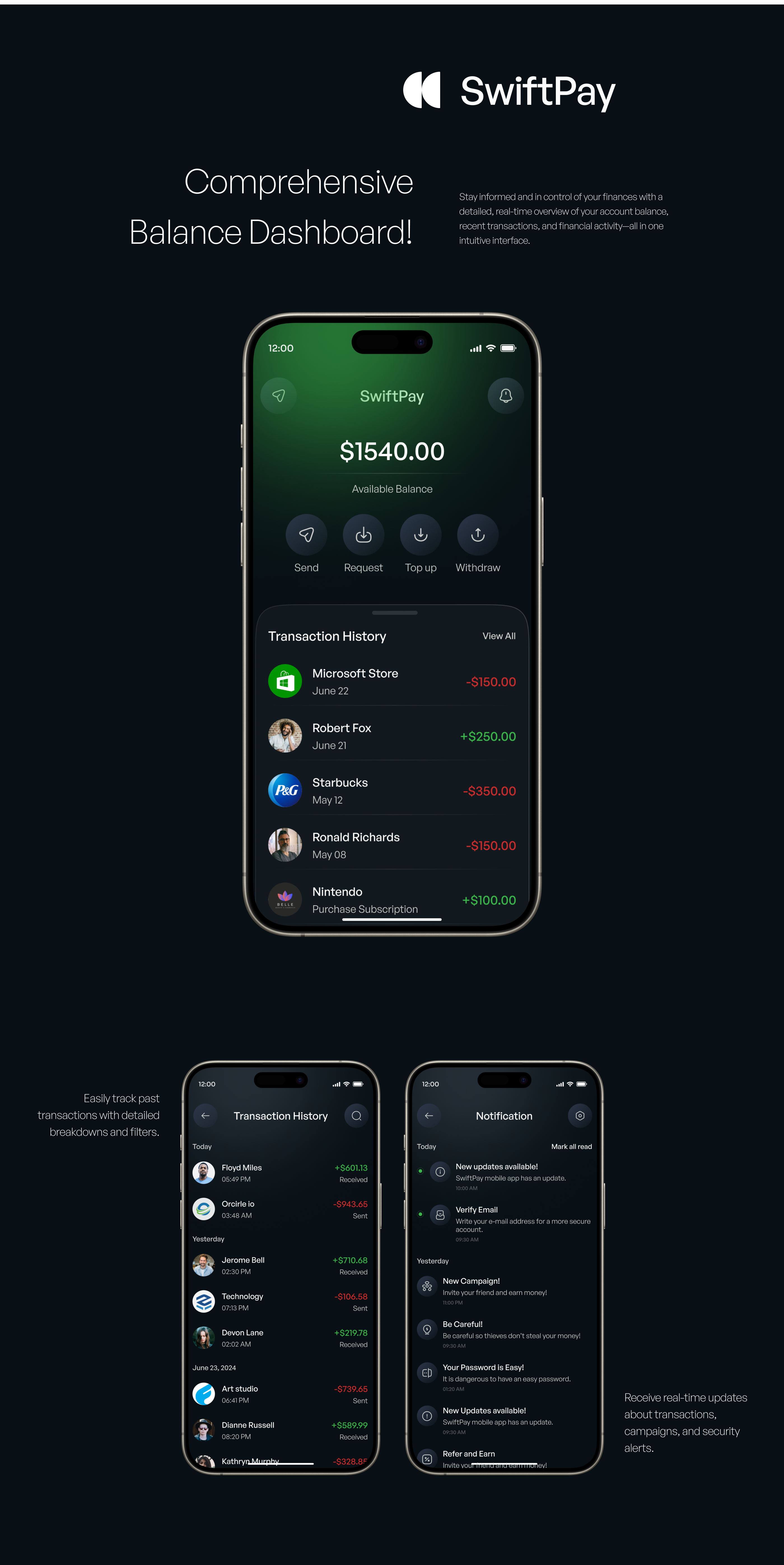 For the SwiftPay project, I designed a modern and intuitive financial app that ensures seamless money transfers, card management, and transaction tracking. My focus was on creating a user-centric interface with clean, minimal visuals to enhance usability and build trust. The logo design reflects simplicity and professionalism, while the overall aesthetic aligns with the app’s secure and reliable nature. Through strategic design decisions, I addressed key challenges in the fintech space, ensuring the app is both functional and visually appealing. This project highlights my ability to merge creativity with practicality in digital product design.